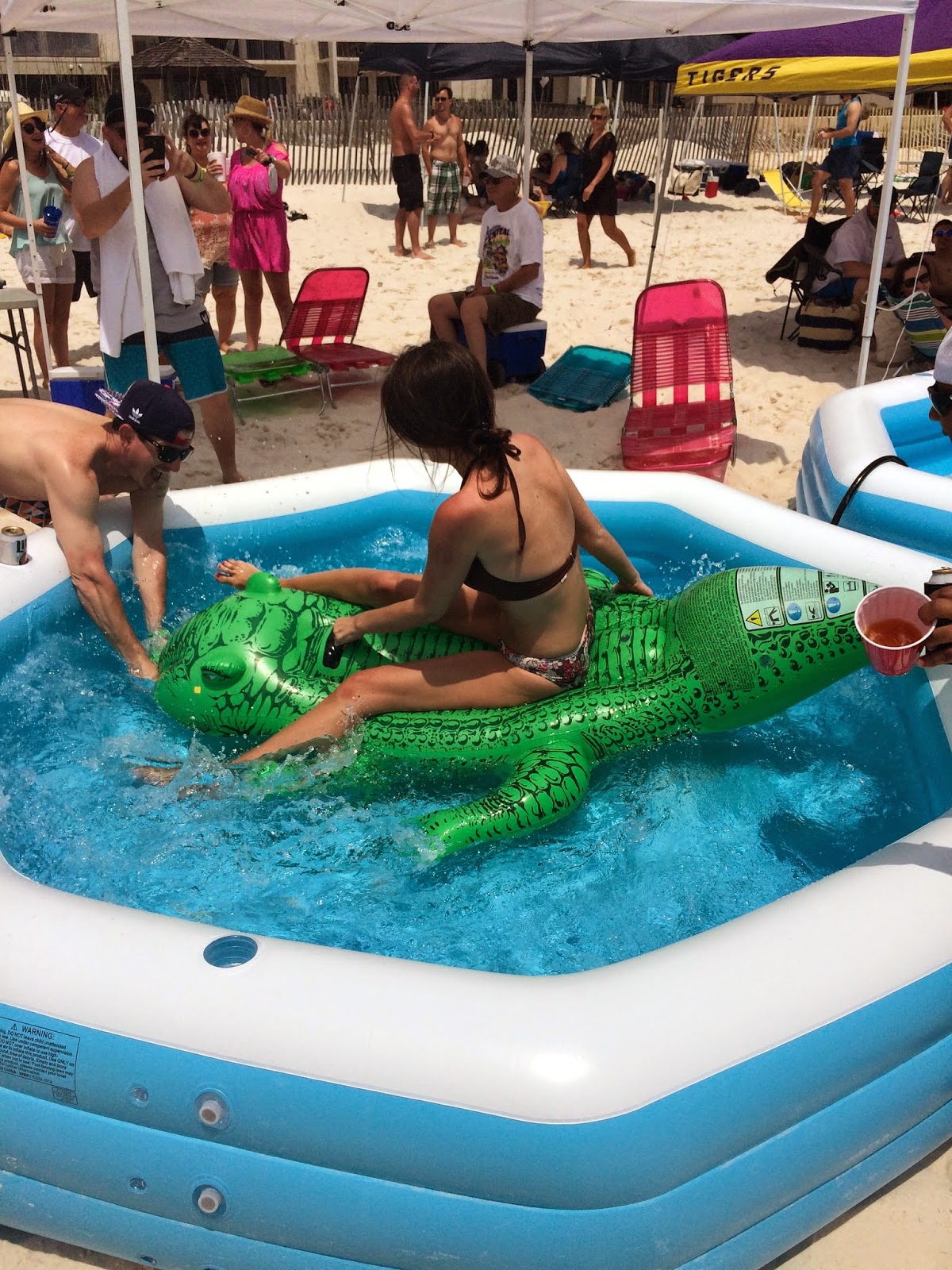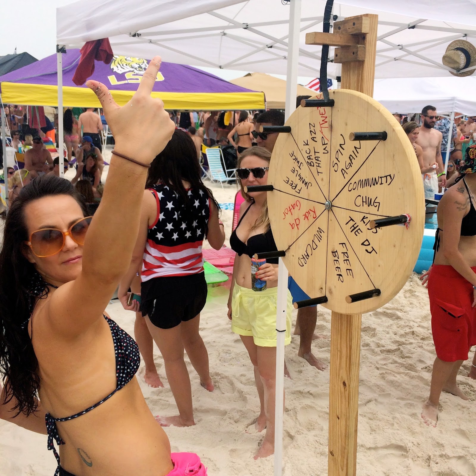Basically insanity on the beach. Surrounded by 100,000 of your closest friends and drinking buddies to party from Friday – Sunday sun up to sun down. Drink of choice is one of two options. Funneling beer out of some high rise, 3 way, shot plus, contraption made by some frat boys or a bushwhacker.