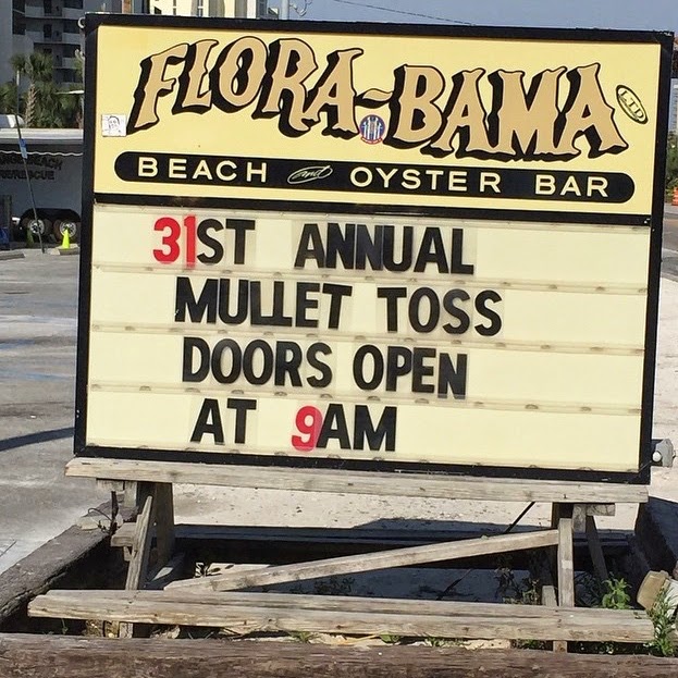 Mullet Toss is where people line up to throw a fish over the state line from Florida to Alabama. Yes this is real life. Welcome to the South!